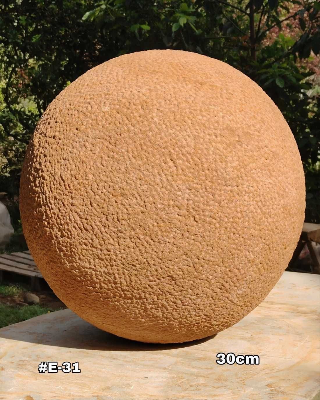 Escultura esférica de gran formato con un diámetro de 30 cm y acabado abujardado. Esta pieza destaca por su color ocre cálido y uniforme, que resalta la perfección de su geometría sagrada y la textura artesanal de la piedra de montaña.