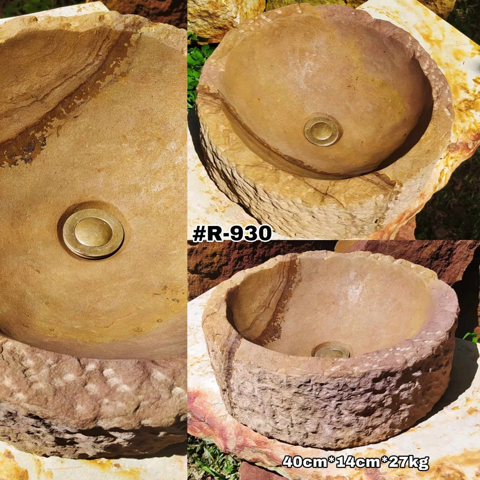 Acentúa la Belleza de tu Espacio El lavamanos de piedra rústica de cantera redondo R-930 es una pieza que combina lo mejor de la artesanía y la funcionalidad. Fabricado con piedra arenisca, este lavamanos especial destaca por su atractiva dualidad de colores, con una mitad en un tono amarillo ocre claro y la otra en un color marrón más intenso, creando un contraste visual único y orgánico. Su característica más notable es la linda veta natural que lo atraviesa, marcando la transición de colores y convirtiéndolo en un verdadero punto focal de cualquier baño. Diseñado a partir de bloques de piedra extraídos de nuestras canteras, cada lavamanos es una verdadera obra artesanal que refleja autenticidad y exclusividad.
