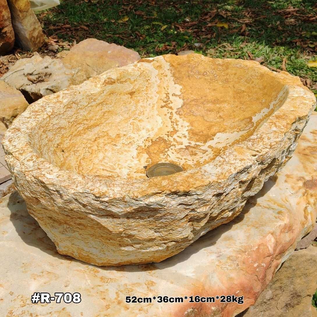 Descripción corta: El #R-708 es una pieza monumental de 52 cm x 36 cm x 16 cm y un peso sólido de 28 kg. Tallado en piedra de cantera de alta densidad, este lavamanos destaca por un patrón de vetas horizontales y tonos dorados que evocan los estratos naturales de la tierra. Su cuenca interior, tratada con pulido diamantado, ofrece un contraste perfecto con su exterior rústico, siendo una opción inmejorable para remodelaciones de baños con carácter y exclusividad.