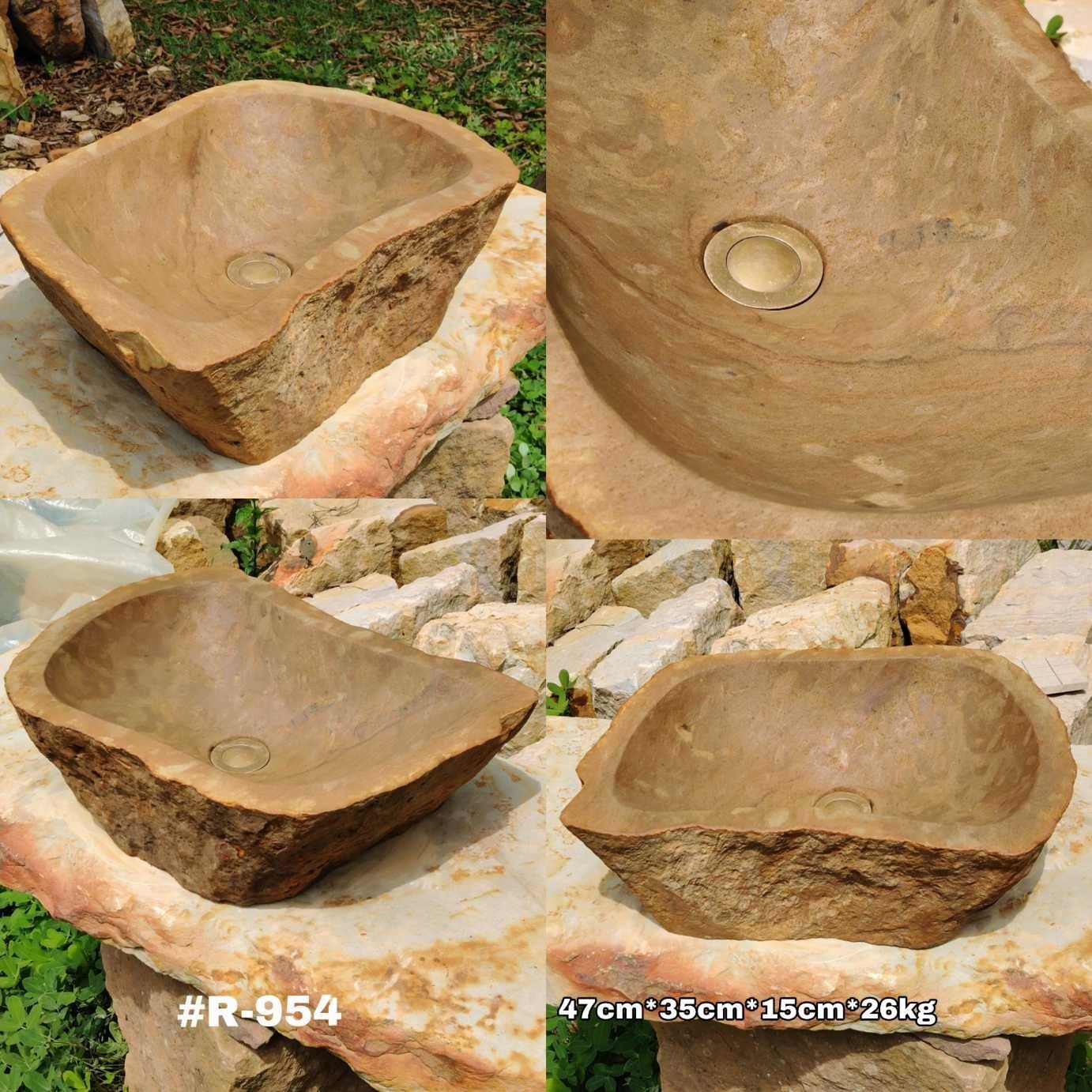 Geometría Viva: El Valor de lo Irrepetible La referencia #R-954 es un ejemplo perfecto de cómo la naturaleza es la mejor arquitecta. Este lavamanos se distingue por su forma asimétrica, donde cada ángulo ofrece una perspectiva diferente de la piedra. Su exterior conserva la textura de «corteza de montaña», con matices ocre y arena que se entrelazan de forma caprichosa, creando una pieza que no solo es funcional, sino que actúa como una escultura central en el cuarto de baño. Es la elección ideal para proyectos residenciales de lujo o espacios comerciales que buscan una estética orgánica y diferenciada.