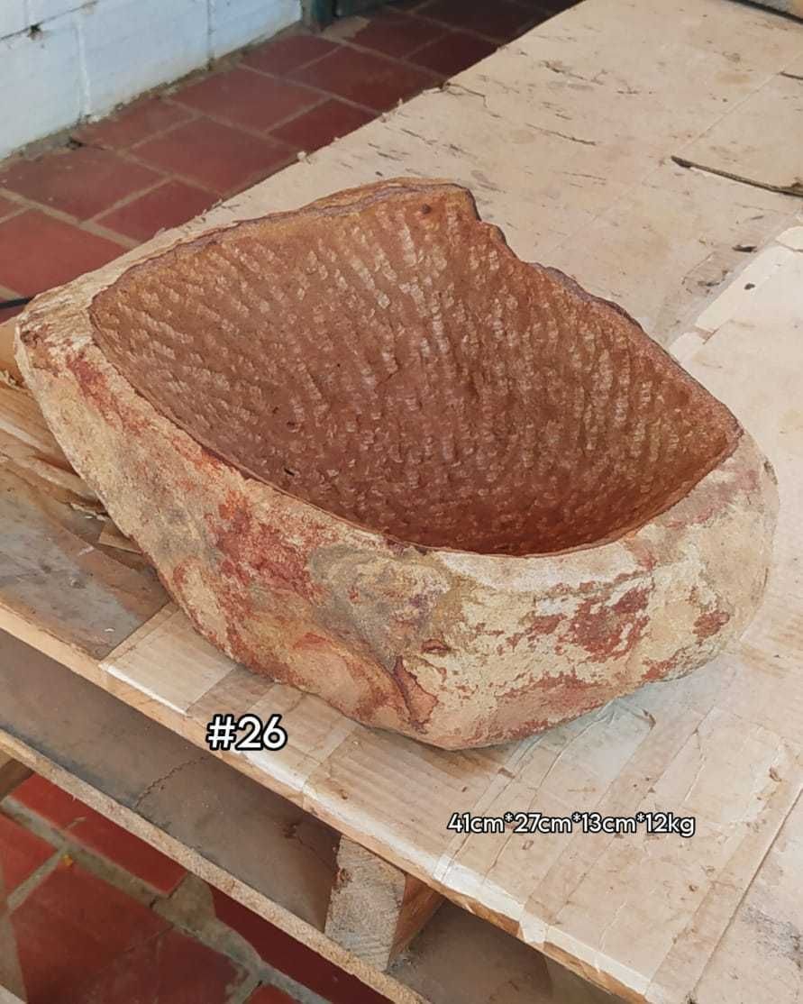 La pila rústica #26 es una pieza de auténtica belleza natural, tallada en piedra arenisca que mantiene su corteza exterior completamente natural , con una mezcla de tonos ocres y rojizos. Su interior ha sido cuidadosamente labrado , conservando una textura que resalta el trabajo artesanal, creando un contraste único con la forma rústica de su exterior. Para asegurar su durabilidad y protegerla de la humedad, toda la pila ha sido tratada con un hidrófugo .